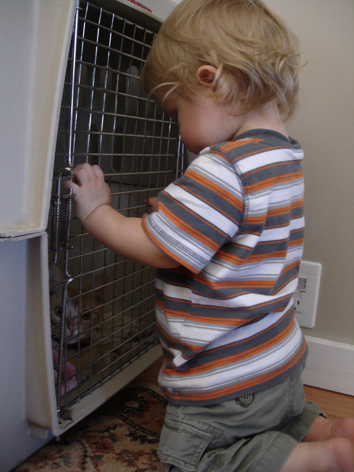 Auntie Muzzie was so kind to rescue a lost kitten that was roaming the neighborhood. She stayed in our cage until someone came to get her. The boys were just in awe. They wanted to keep the kitty and as soon as Ethan found out she wasn't ours, he was pretty upset. Sam wanted to play with her and kept trying to open the dog cage. Nick and I are both severely allergic to cats, so we will never own one...but it was fun while it lasted!